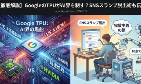 【徹底解説】GoogleのTPUがAI界を制す?SNSスランプ脱出術も伝授 イントロダクション こんにちは、monotips stationです。2026年2月18日、ようやく編集長のあらかわが上咽頭炎のガサガサ声から完…