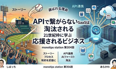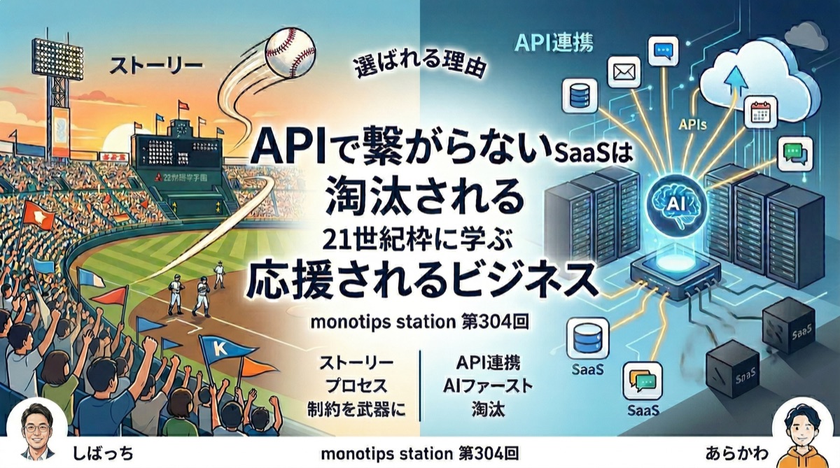今回のmonotips stationでは、2つのテーマをお届けします。1つ目は、しばっちが語る「選抜高校野球の21世紀枠から考える、ビジネスで応援されるプロセスの価値」。母校・長崎西高校の75年ぶりの甲子園出場を通じて、中小企業が大企業に勝つためのストーリーの力を掘り下げます。2つ目は、あらかわが解説する「APIで繋がらないサービスはヤバいTIPS」。Claude Codeの実体験から、APIファーストの時代にSaaSがどう淘汰されていくかを語ります。