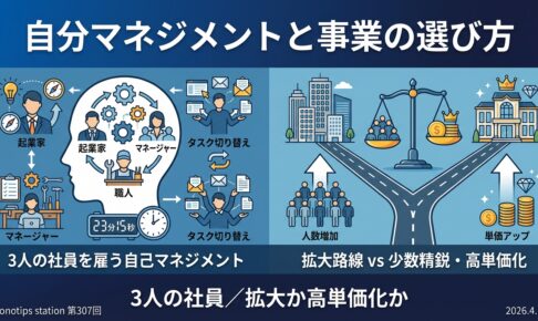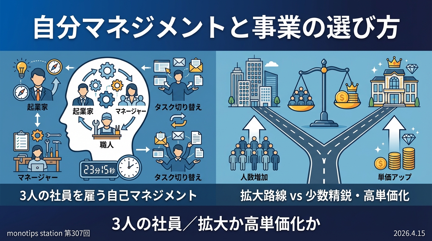 1つ目は、あらかわが語る「自分の中の3人の社員 — フリーランスにこそマネジメントが必要なチップス」。タスクを1回切り替えるたびに集中が戻るまで23分15秒かかる、という衝撃のデータから、自分自身を雇用する発想と週1回30分の”自分1on1″の進め方までを解説します。2つ目は、しばっちが語る「事業の拡大か少数精鋭の高単価化か — ビジネスの正解を決めるための考え方」。忙しくなってきた一人事業者が次に選ぶ道、その両方のメリットと落とし穴を整理します。